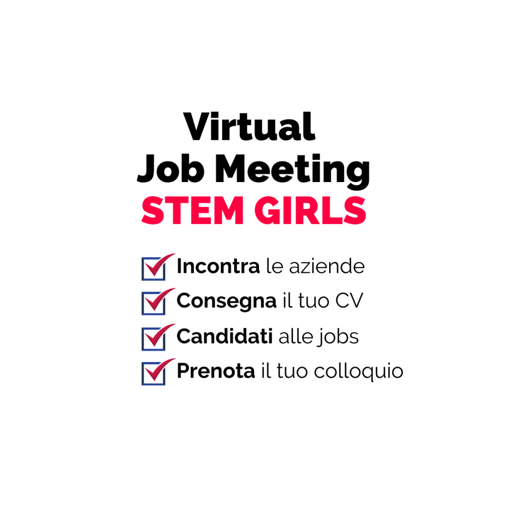 Virtual Job Meeting STEM GIRLS è l’occasione giusta per tutte le giovani donne laureate e neo-laureate in materie STEM (S*cienze, T*echnology, E*ngineering, M*athematics) in cerca del lavoro di incontrare direttamente i responsabili HR e Recruiter di grandi aziende italiane e Multinazionali che offrono opportunità di lavoro.